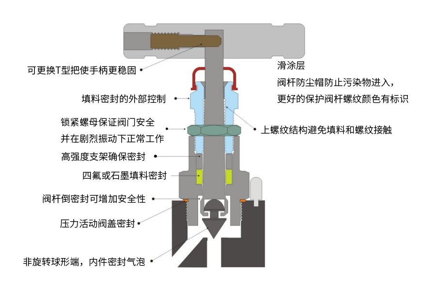 閥桿與填料接觸處經(jīng)拋光處理保證良好的密封性并增加使用壽命
